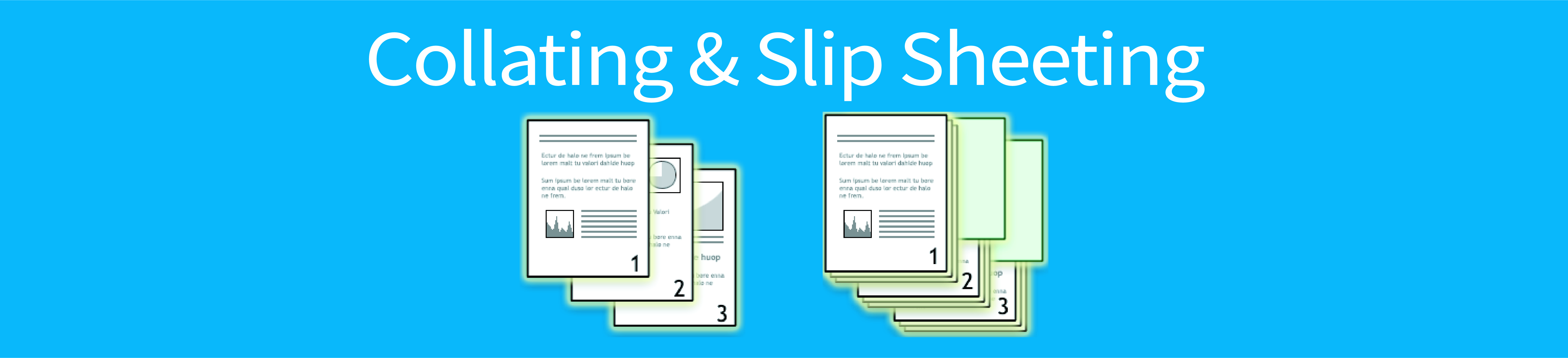In printing, slip sheeting refers to placing a blank piece of paper between groups of printed pages. It can be used with collated or uncollated pages. Slip sheets make it easy to see where one set stops and another begins, especially when stacked loose one on top of another and packed in cartons.